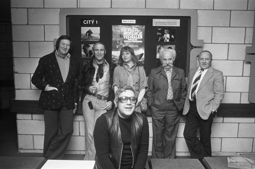 Première van Zwaarmoedige verhalen op 19 maart 1975. Heere Heeresma op de voorgrond. Achter hem (vlnr) Jon Bluming, Hugo Metsers, Pleuni Touw, Lex Goudsmit en Johnny Kraaijkamp © Hans Peters/ Anefo (cc0)